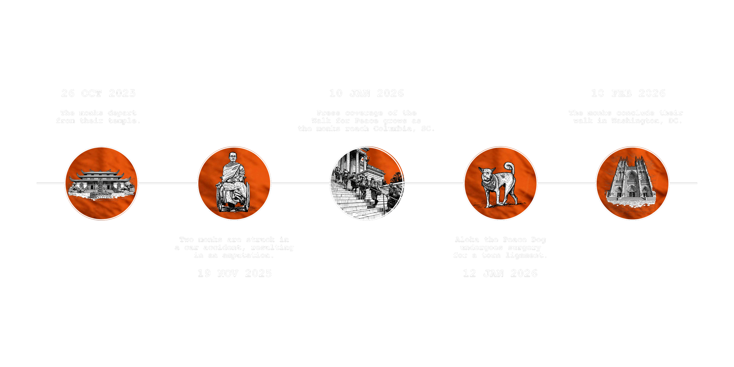 As long as the 2,300-mile distance traveled was, longer still is the tradition of the peace walk. As the monks entered the District, their robes and accoutrements swaying from their bodies as they moved in unhurried procession, the layers of whispering cloth echoed back to the Dhammayietra, the peace walks of Cambodia that saw monks and laypeople cross mine-scarred land in the hope of collective healing. In 1930, Mahatma Gandhi led the Salt March, a 240-mile nonviolent protest against British salt taxes in colonial India. This act of walking as resistance or moral witness helped define the concept of satyagraha (“truth-force”) that influenced later movements for civil rights and justice around the world. And in the United States, the Selma to Montgomery marches in 1965 similarly used sustained walking to demand voting rights for African Americans. Over the course of three weeks, hundreds of advocates—guided by leaders like Dr. Martin Luther King, Jr.—made their way from Selma, Alabama, to the state capital in Montgomery, helping catalyze the passage of the Voting Rights Act.